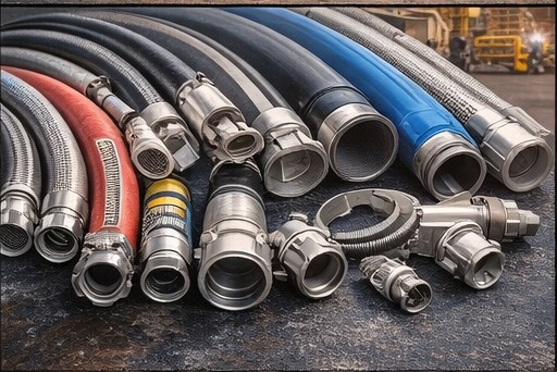 Flexible hoses, couplings, connectors, clamps, and fluid-transfer support items.