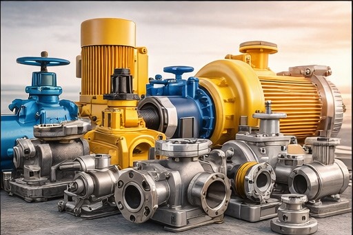 Pumps, valve bodies, fittings, motor-related components, and mechanical support spares.